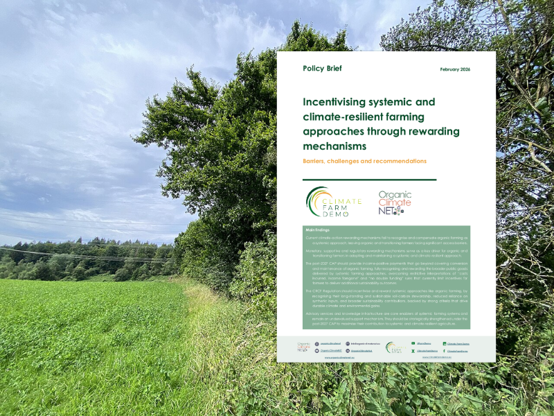 This policy brief examines how current climate-action rewarding mechanisms address – or fail to address – organic farming as a systemic and climate-resilient approach. It analyses existing monetary, regulatory and supportive instruments at EU level, with a particular focus on the Common Agricultural Policy (CAP) and the Carbon Removal and Carbon Farming (CRCF) Regulation. Current mechanisms largely fail to recognise organic farming as a whole-farm system delivering integrated climate and environmental benefits. As a result, organic and transitioning farmers face significant access barriers to climate-related funding streams, as most schemes prioritise individual practices rather than systemic approaches.