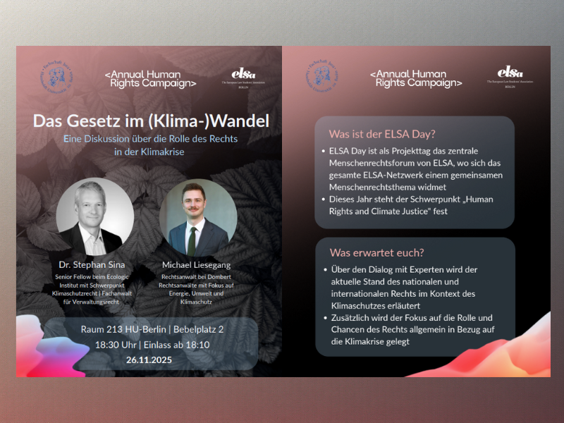 Am 26. November 2025 nahm Dr. Stephan Sina, Senior Fellow am Ecologic Institut, an einer Diskussionsrunde mit Jurastudent:innen über die Rolle des Rechts in der Klimakrise an der Humboldt-Universität zu Berlin teil. Die Veranstaltung wurde von der European Law Students' Association (el§a) Berlin organisiert, die auch die Moderation übernahm. Zusammen mit einem anderen Experten, Rechtsanwalt Michael Liesegang von Dombert Rechtsanwälte, diskutierte Stephan Sina über die Gesetzgebung im Klimaschutzrecht, Hürden bei der Umsetzung von Maßnahmen zur Erreichung von Klimazielen, die Rolle von Gerichten, Herausforderungen für Unternehmen, die sich nachhaltig verhalten wollen, und Möglichkeiten für Jurastudent:innen, zum Schutz des Klimas beizutragen.