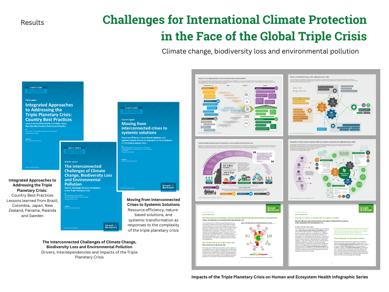 Die Publikationen untersuchen gemeinsame Treiber und Rückkopplungen der Dreifachkrise, machen soziale und ökologische Risiken sichtbar und zeigen integrierte Handlungsansätze auf, mit denen Synergien zwischen Klimaschutz, Biodiversitätserhalt und der Reduktion von Umweltverschmutzung geschaffen werden können.